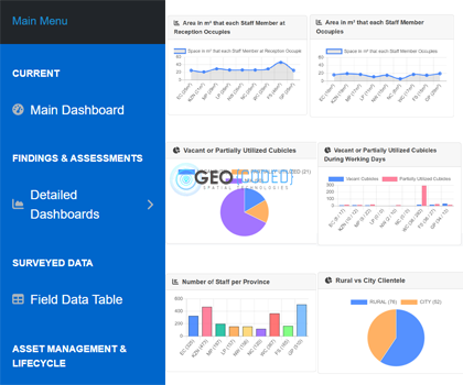 Geographic Information Systems | CAD designs | LiDAR Scanning | Indoor Mapping | As-Built Floor Layouts | Scan to BIM | 3D Models | 360° Virtual Tours | Full Stack Software Development | Mobile Applications Development | Web Applications Development | Asset Management Systems Development | Pavement Management Systems | Project Management | Virtual Reality | Augmented Reality | Mapping Design | Database Design and Administration | Training.